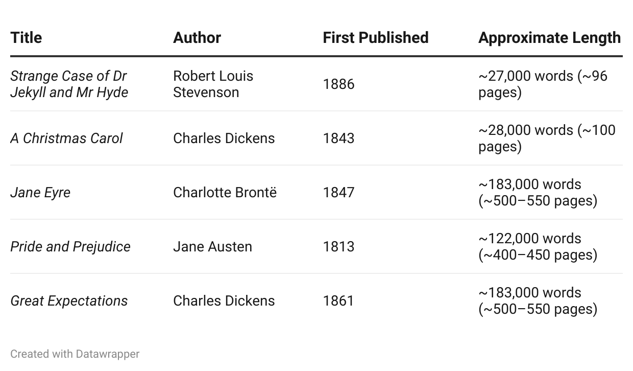 What might influence the choice of a 19th-century novel besides its literary qualities? The TES article mentions that Strange Case of Dr Jekyll and Mr Hyde and A Christmas Carol are most commonly picked across the three exam boards. Jane Eyre, Pride and Prejudice and Great Expectations were much less common. Why is this? Could the right-most column below have anything to do with it?