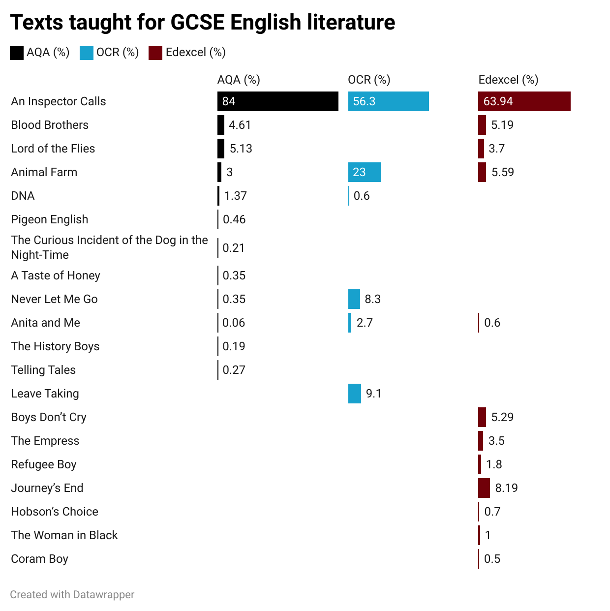 A recent TES article highlights the dominance of An Inspector Calls in the GCSE English literature curriculum, with high uptake across all major exam boards in June 2024: 84.00% of AQA students, 63.94% of Edexcel students, and 56.30% of OCR students studied the text.